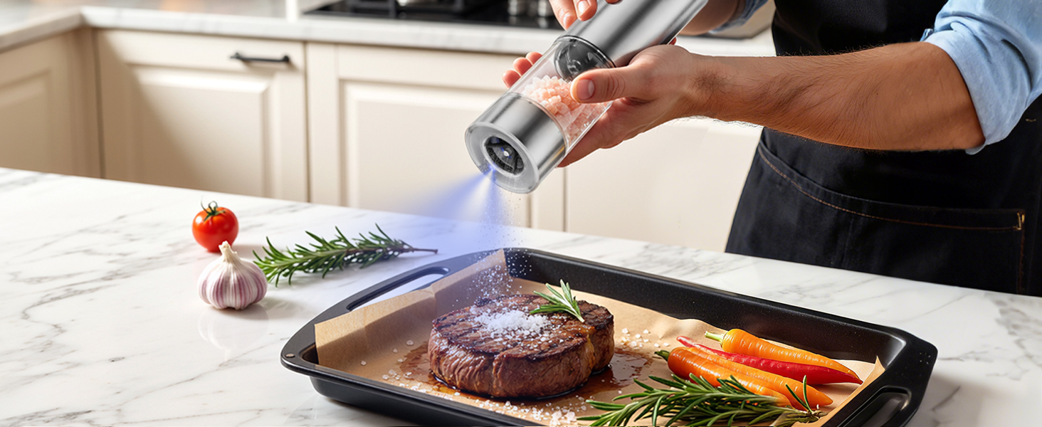 Adjust the coarseness of the seasoning grind to add flavor to your dishes.